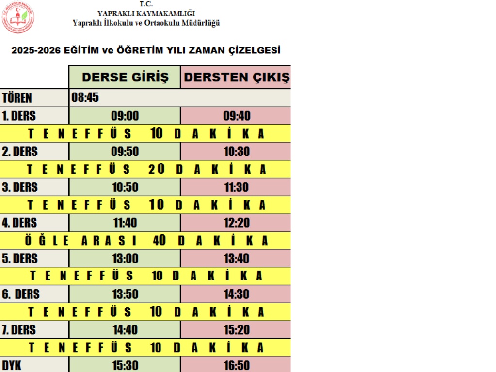2025-2026 Eğitim-Öğretim Yılı kapsamında derslerin daha verimli işlenebilmesi ve öğrencilerimizin ulaşım-güvenlik durumlarının gözetilmesi amacıyla okulumuzun giriş-çıkış saatlerinde düzenleme yapılmıştır.